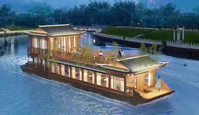 畫舫船就是裝飾古典華麗的游船,是"中國風(fēng)"的仿古游船,結(jié)合古典園林建筑,體現(xiàn)了中華文明的古典藝術(shù).畫舫船豪華而又古典,船上的建筑按照中國古代建筑里的亭臺(tái)樓閣,建筑工藝之復(fù)雜,要求之嚴(yán)格,仿古畫舫游船的特點(diǎn)飛檐翹角、玲瓏精致的四角亭子逐漸成形,赫然立于船頭,美人靠、盤龍柱子、彩畫……龍柱上的浮雕盤龍和祥云一層扣著一層,層層錯(cuò)落有致,雕刻精細(xì)到盤龍身上的每一個(gè)鱗片都細(xì)細(xì)可數(shù),古代皇家標(biāo)志性元素,在畫舫船上體現(xiàn)的淋漓盡致。除了雕刻、花窗,整條船還有一個(gè)看點(diǎn),那就是弧線優(yōu)美、高高翹起的船尾。游船并不大,長約10米、寬3米,但是整體看起來堪稱一件藝術(shù)品。船尾的雕花欄桿與船艙、船頭的雕刻遙相呼應(yīng),船身四周貼著浮雕祥云,給整條船增添了富貴、華麗的氣質(zhì)。